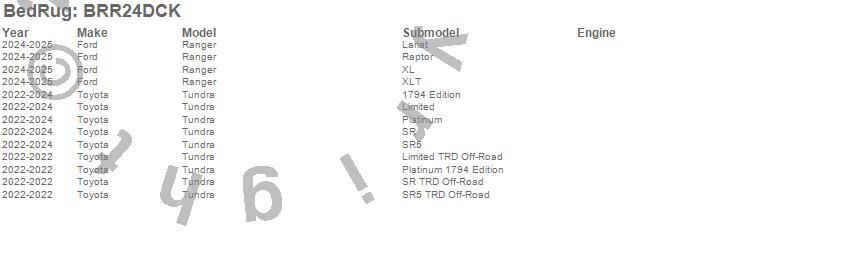 Below is an abbreviated list of applications for the BedRug Truck Bed Liner.Ranger, Tundra, Ford, Toyota, 2025, 2024, 2023, 2022