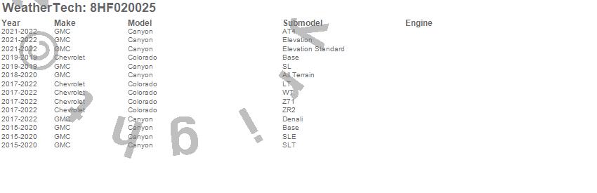 Brand: WeatherTechPart Number: 8HF020025Tonneau Cover Type: UPC: 787765732048