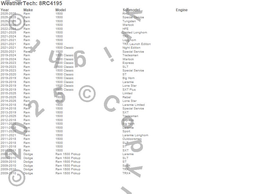 Below is an abbreviated list of applications for the WeatherTech Roll Up Truck Bed Cover.1500, 1500 Classic, Ram 1500, Dodge, Ram, 2025, 2024, 2023, 2022, 2021, 2020, 2019, 2018, 2017, 2016, 2015, 2014, 2013, 2012, 2011
