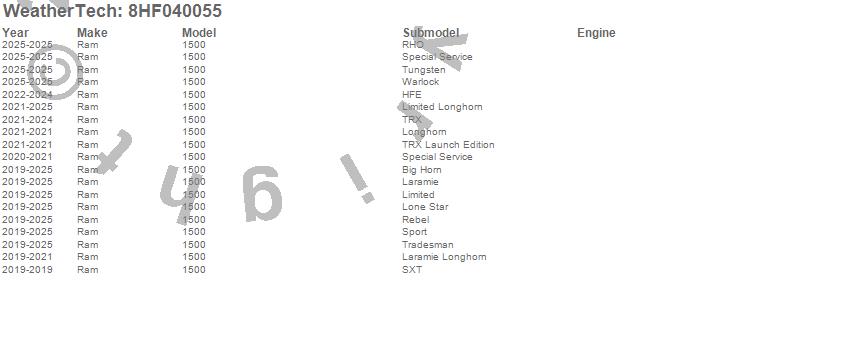 Brand: WeatherTechPart Number: 8HF040055Tonneau Cover Type: UPC: 787765885492