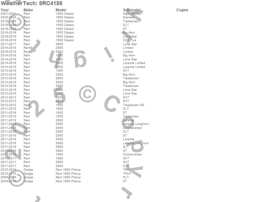 Below is an abbreviated list of applications for the WeatherTech Roll Up Truck Bed Cover.1500, 1500 Classic, 2500, 3500, Ram 1500, Ram 2500, Ram 3500, Dodge, Ram, 2024, 2023, 2022, 2021, 2020, 2019, 2018, 2017, 2016, 2015, 2014