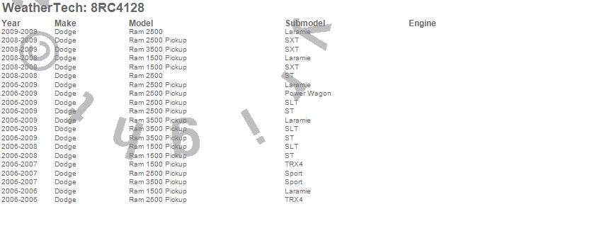Below is an abbreviated list of applications for the WeatherTech Roll Up Truck Bed Cover.Ram 1500, Ram 2500, Ram 3500, Dodge, 2009, 2008, 2007, 2006, 2005, 2004, 2003, 2002