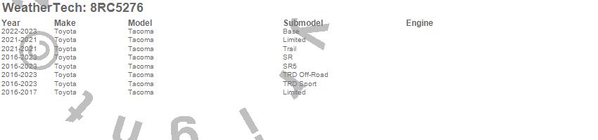 Brand: WeatherTechPart Number: 8RC5276Tonneau Cover Type: UPC: 787765654081