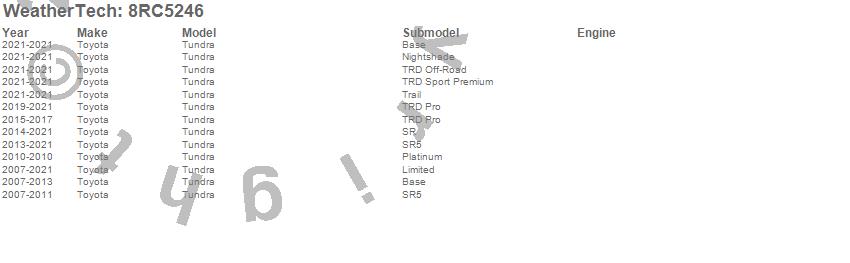 Below is an abbreviated list of applications for the WeatherTech Roll Up Truck Bed Cover.Tundra, Toyota, 2021, 2020, 2019, 2018, 2017, 2016, 2015, 2014, 2013, 2012, 2011, 2010, 2009, 2008, 2007