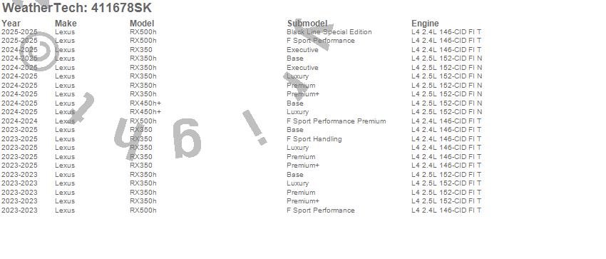 Below is an abbreviated list of applications for the Cargo Liner w/Bumper Protector.RX350, RX350h, RX450h+, RX500h, Lexus, 2026, 2025, 2024, 2023