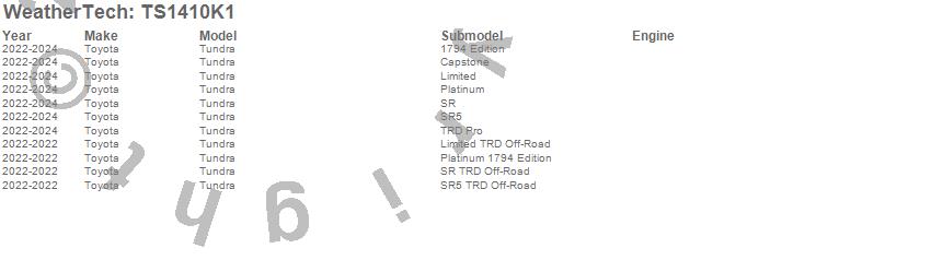Below is an abbreviated list of applications for the WeatherTech SunShade Full Vehicle Kit.Tundra, Toyota, 2025, 2024, 2023, 2022