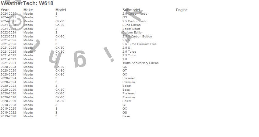 Below is an abbreviated list of applications for the All Weather Floor Mats.3, CX-30, Mazda, 2025, 2024, 2023, 2022, 2021, 2020, 2019