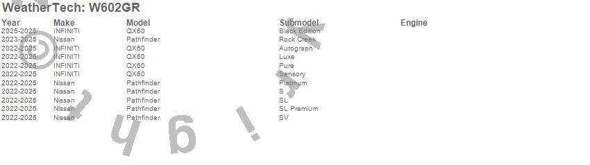 Below is an abbreviated list of applications for the All Weather Floor Mats.Pathfinder, QX60, INFINITI, Nissan, 2025, 2024, 2023, 2022