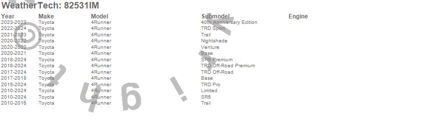 Below is an abbreviated list of applications for the Side Window Deflector Set.4Runner, Toyota, 2024, 2023, 2022, 2021, 2020, 2019, 2018, 2017, 2016, 2015, 2014, 2013, 2012, 2011, 2010