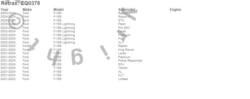 Below is an abbreviated list of applications for the Retrax EQ Retractable Tonneau Cover.F-150, F-150 Lightning, Ford, 2024, 2023, 2022, 2021