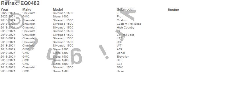 Below is an abbreviated list of applications for the Retrax EQ Retractable Tonneau Cover.Sierra 1500, Silverado 1500, Chevrolet, GMC, 2024, 2023, 2022, 2021, 2020, 2019
