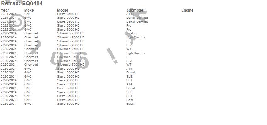 Below is an abbreviated list of applications for the Retrax EQ Retractable Tonneau Cover.Sierra 2500 HD, Sierra 3500 HD, Silverado 2500 HD, Silverado 3500 HD, Chevrolet, GMC, 2024, 2023, 2022, 2021, 2020