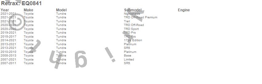 Below is an abbreviated list of applications for the Retrax EQ Retractable Tonneau Cover.Tundra, Toyota, 2021, 2020, 2019, 2018, 2017, 2016, 2015, 2014, 2013, 2012, 2011, 2010, 2009, 2008, 2007