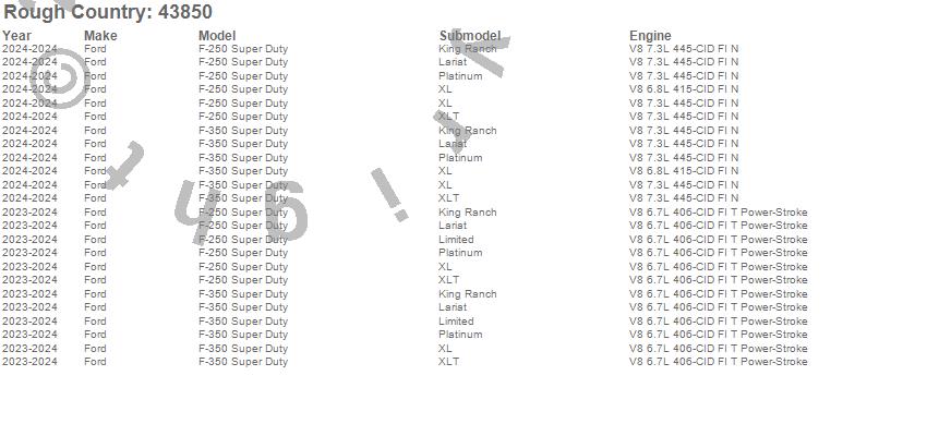 Below is an abbreviated list of applications for the Suspension Lift Kit w/Shocks.F-250 Super Duty, F-350 Super Duty, Ford, 2025, 2024, 2023