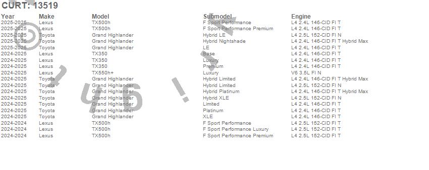 Below is an abbreviated list of applications for the Class III 2 in. Receiver Hitch.Grand Highlander, TX350, TX500h, TX550h+, Lexus, Toyota, 2026, 2025, 2024