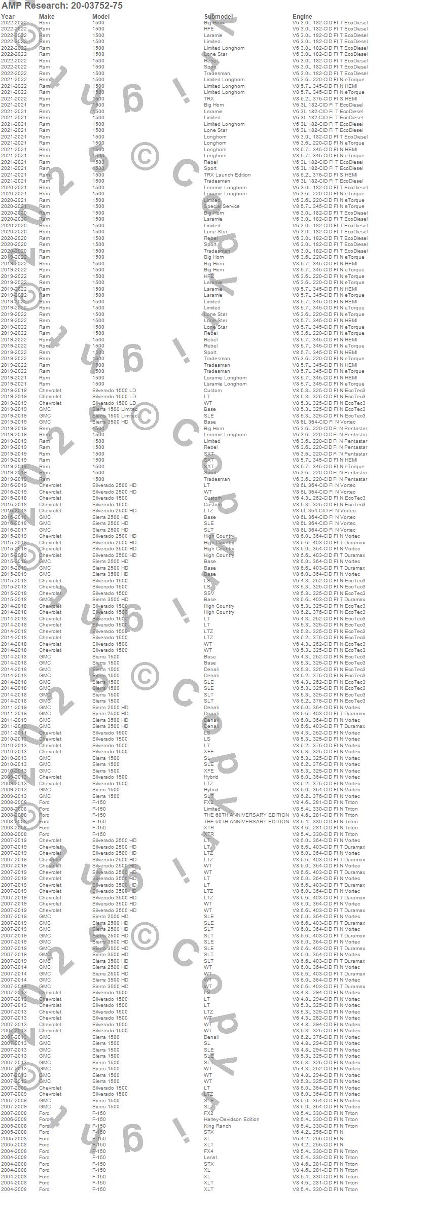 Below is an abbreviated list of applications for the PowerStep.1500, F-150, Sierra 1500, Sierra 1500 Limited, Sierra 2500 HD, Sierra 3500 HD, Silverado 1500, Silverado 1500 LD, Silverado 2500 HD, Silverado 3500 HD, Chevrolet, Ford, GMC, Ram, 2022, 2021, 2020, 2019, 2018, 2017