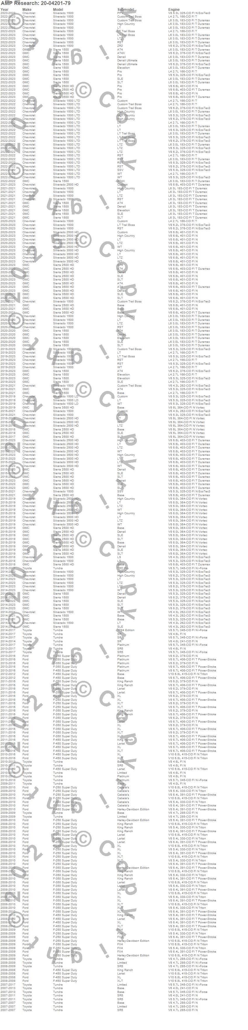Below is an abbreviated list of applications for the PowerStep.F-250 Super Duty, F-350 Super Duty, F-450 Super Duty, Sierra 1500, Sierra 2500 HD, Sierra 3500 HD, Silverado 1500, Silverado 1500 LD, Silverado 1500 LTD, Silverado 2500 HD, Silverado 3500 HD, Tundra, Chevrolet, Ford, GMC, Toyota, 2023, 2022, 2021, 2020