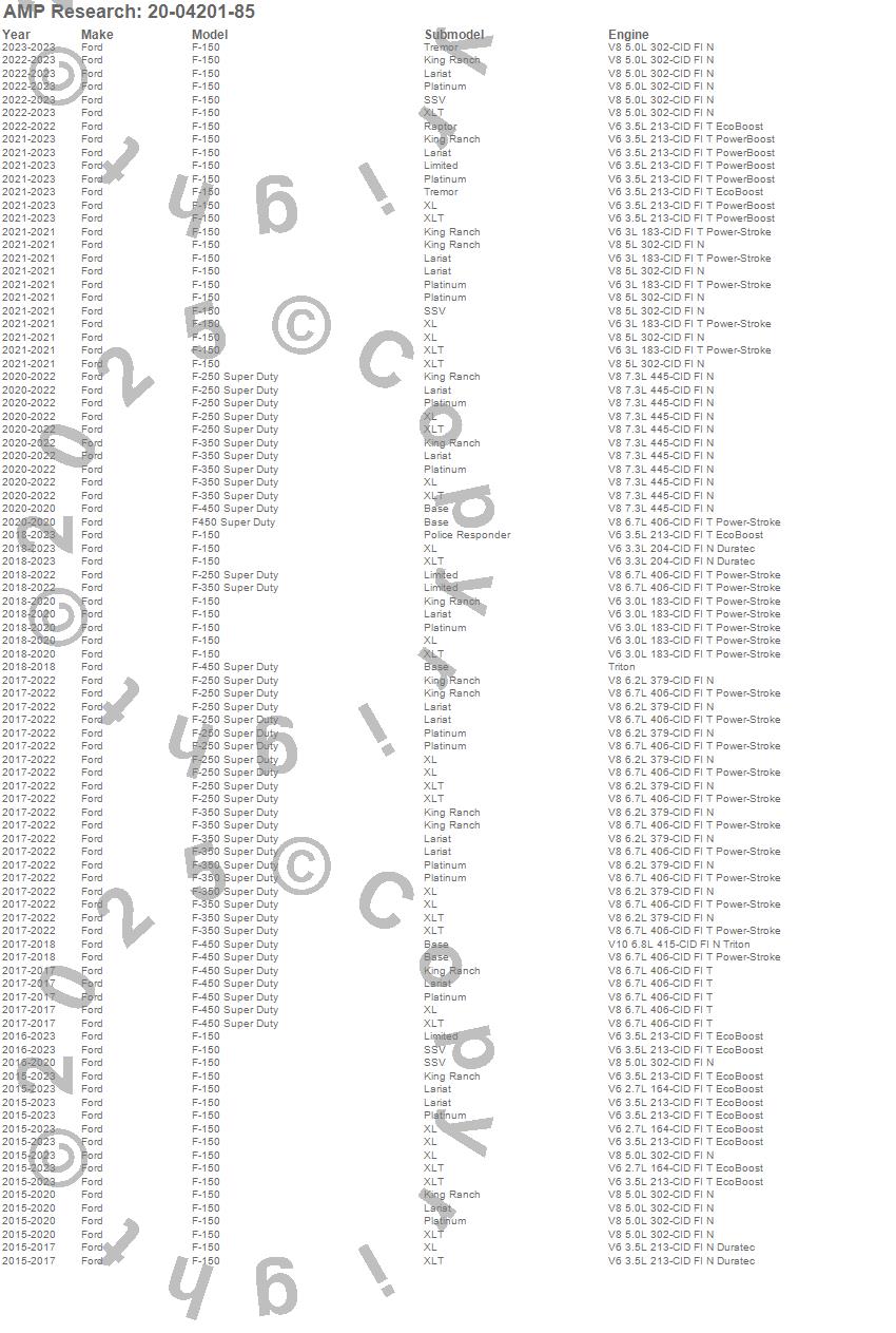 Below is an abbreviated list of applications for the PowerStep.F-150, F-250 Super Duty, F-350 Super Duty, F-450 Super Duty, F450 Super Duty, Ford, 2023, 2022, 2021, 2020, 2019, 2018, 2017, 2016, 2015