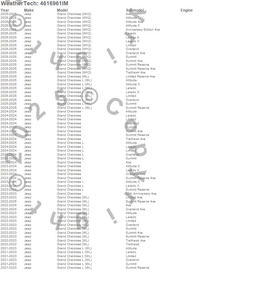 Below is an abbreviated list of applications for the FloorLiner HP.Grand Cherokee, Grand Cherokee (WK2), Grand Cherokee (WL), Grand Cherokee L, Grand Cherokee L (WL), Jeep, 2025, 2024, 2023, 2022, 2021