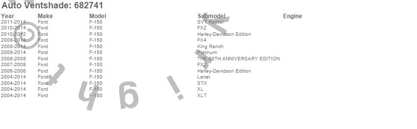 Below is an abbreviated list of applications for the Chrome Ventvisor Deflector 2 pc..F-150, Ford, 2014, 2013, 2012, 2011, 2010, 2009, 2008, 2007, 2006, 2005, 2004