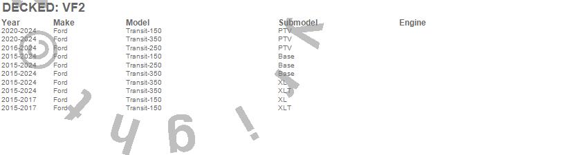 Below is an abbreviated list of applications for the DECKED Cargo Van Storage System.Transit-150, Transit-250, Transit-350, Transit-350 HD, Ford, 2025, 2024, 2023, 2022, 2021, 2020, 2019, 2018, 2017, 2016, 2015