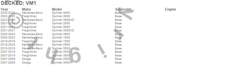 Below is an abbreviated list of applications for the DECKED Cargo Van Storage System.Sprinter 1500, Sprinter 2500, Sprinter 3500, Sprinter 3500XD, Sprinter 4500, Dodge, Freightliner, Mercedes-Benz, 2025, 2024, 2023, 2022, 2021, 2020, 2019, 2018, 2017, 2016, 2015, 2014