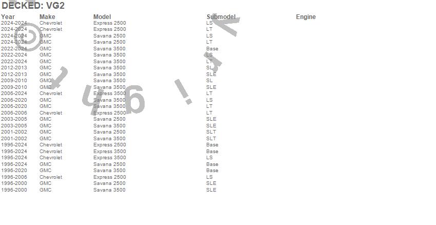 Below is an abbreviated list of applications for the DECKED Cargo Van Storage System.Express 2500, Express 3500, Savana 2500, Savana 3500, Chevrolet, GMC, 2025, 2024, 2023, 2022, 2021, 2020, 2019, 2018, 2017, 2016, 2015, 2014, 2013, 2012