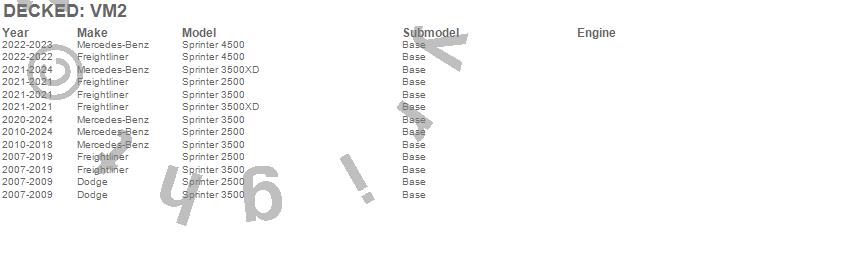Below is an abbreviated list of applications for the DECKED Cargo Van Storage System.Sprinter 2500, Sprinter 3500, Sprinter 3500XD, Sprinter 4500, Dodge, Freightliner, Mercedes-Benz, 2025, 2024, 2023, 2022, 2021, 2020, 2019, 2018, 2017, 2016, 2015, 2014, 2013