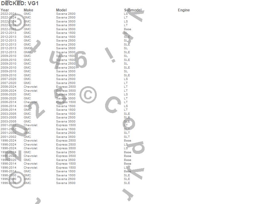 Below is an abbreviated list of applications for the DECKED Cargo Van Storage System.Express 1500, Express 2500, Express 3500, Savana 1500, Savana 2500, Savana 3500, Chevrolet, GMC, 2025, 2024, 2023, 2022, 2021, 2020, 2019, 2018, 2017, 2016, 2015, 2014