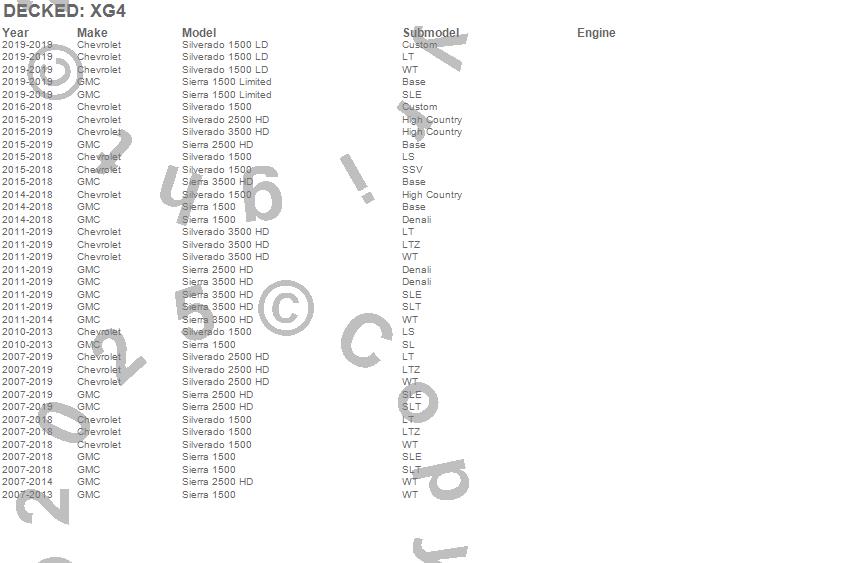 Below is an abbreviated list of applications for the DECKED Two Drawer Storage System.Sierra 1500, Sierra 1500 Limited, Sierra 2500 HD, Sierra 3500 HD, Silverado 1500, Silverado 1500 LD, Silverado 2500 HD, Silverado 3500 HD, Chevrolet, GMC, 2019, 2018, 2017, 2016, 2015, 2014, 2013, 2012, 2011, 2010