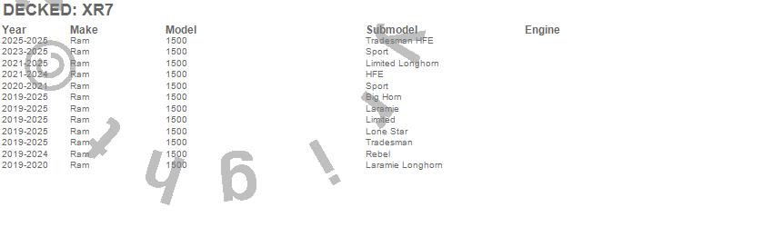 Brand: DECKEDPart Number: XR7Truck Bed Storage System Type: Made Of High Density Polyethylene - Stainless Steel Hardware - Features Cast Aluminum Handles / Galvanized Steel SubframeUPC: 850025181273