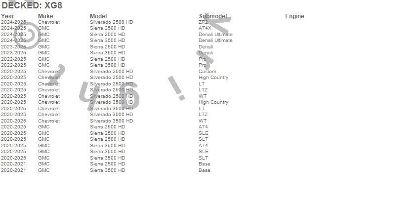 Below is an abbreviated list of applications for the DECKED Two Drawer Storage System.Sierra 2500 HD, Sierra 3500 HD, Silverado 2500 HD, Silverado 3500 HD, Chevrolet, GMC, 2026, 2025, 2024, 2023, 2022, 2021, 2020