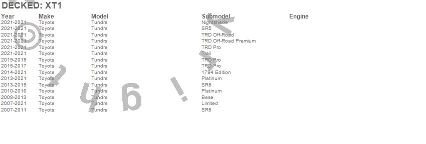 Below is an abbreviated list of applications for the DECKED Two Drawer Storage System.Tundra, Toyota, 2021, 2020, 2019, 2018, 2017, 2016, 2015, 2014, 2013, 2012, 2011, 2010, 2009, 2008, 2007