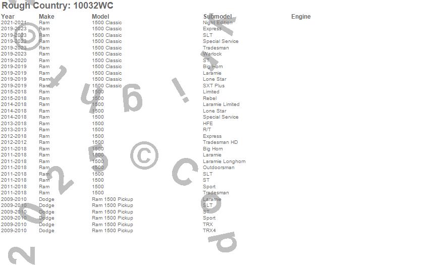 Below is an abbreviated list of applications for the Air Spring Kit.1500, 1500 Classic, Ram 1500, Dodge, Ram, 2023, 2022, 2021, 2020, 2019, 2018, 2017, 2016, 2015, 2014, 2013, 2012, 2011, 2010, 2009