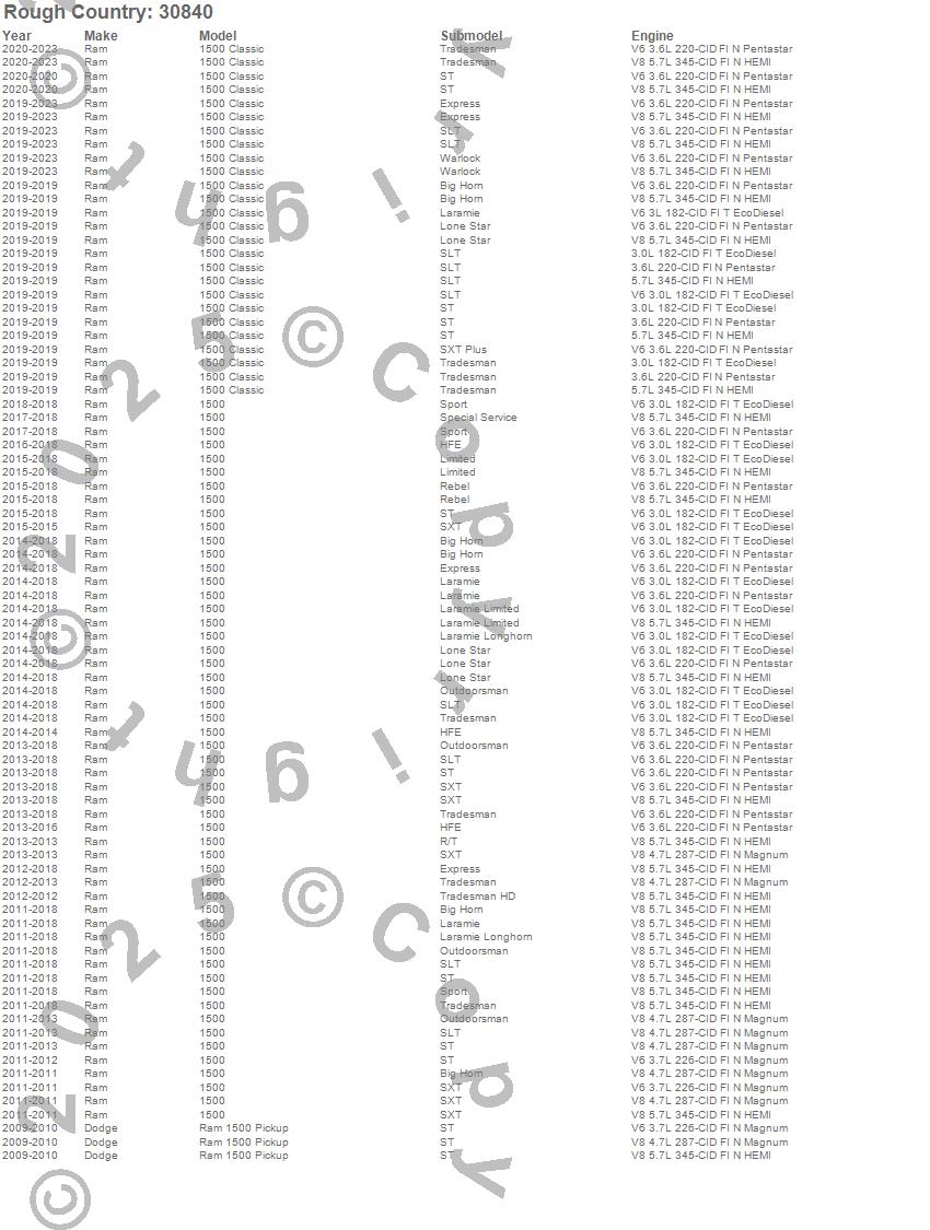 Below is an abbreviated list of applications for the Suspension Lift Kit w/Shocks.1500, 1500 Classic, Ram 1500, Dodge, Ram, 2023, 2022, 2021, 2020, 2019, 2018, 2017, 2016, 2015, 2014, 2013, 2012, 2011, 2010, 2009