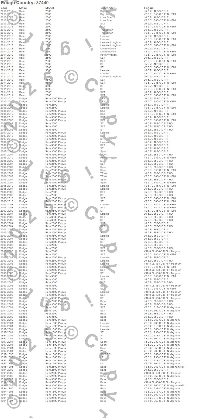 Below is an abbreviated list of applications for the Leveling Lift Kit w/Shocks.2500, 3500, Ram 1500, Ram 2500, Ram 3500, Dodge, Ram, 2013, 2012, 2011, 2010, 2009, 2008, 2007, 2006, 2005, 2004, 2003, 2002, 2001