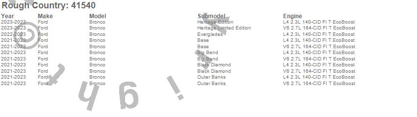 Below is an abbreviated list of applications for the Suspension Lift Kit w/Shocks.Bronco, Ford, 2025, 2024, 2023, 2022, 2021