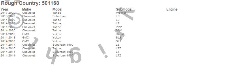 Below is an abbreviated list of applications for the Lifted N3 Struts.Suburban, Suburban 1500, Tahoe, Yukon, Chevrolet, GMC, 2020, 2019, 2018, 2017, 2016, 2015, 2014
