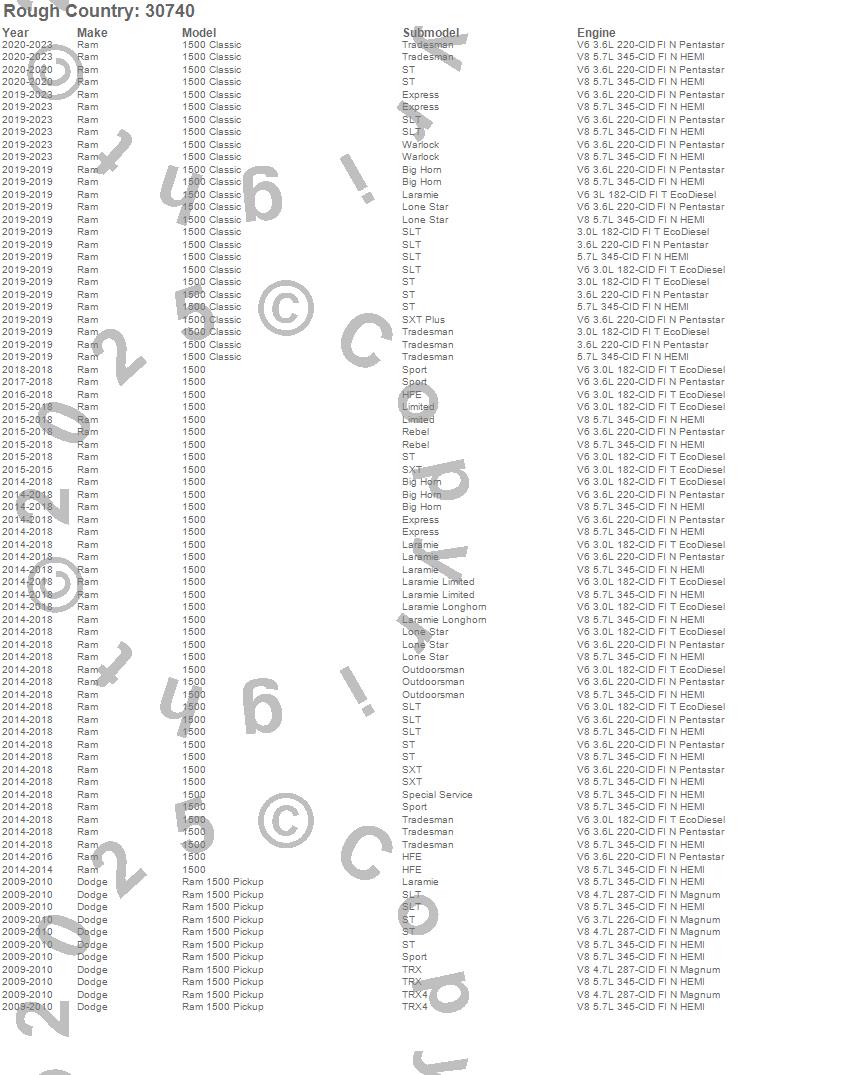 Below is an abbreviated list of applications for the Suspension Lift Kit w/Shocks.1500, 1500 Classic, Ram 1500, Dodge, Ram, 2023, 2022, 2021, 2020, 2019, 2018, 2017, 2016, 2015, 2014, 2010, 2009
