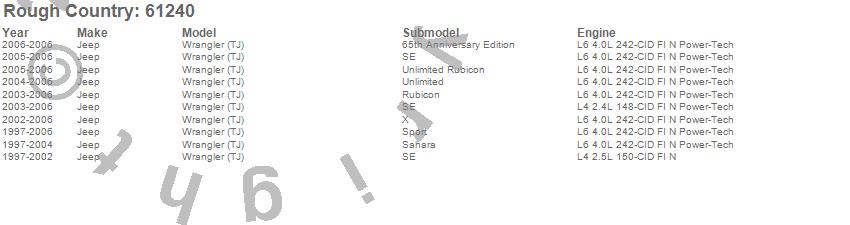 Below is an abbreviated list of applications for the Suspension Lift Kit w/Shocks.Wrangler (TJ), Jeep, 2006, 2005, 2004, 2003, 2002, 2001, 2000, 1999, 1998, 1997