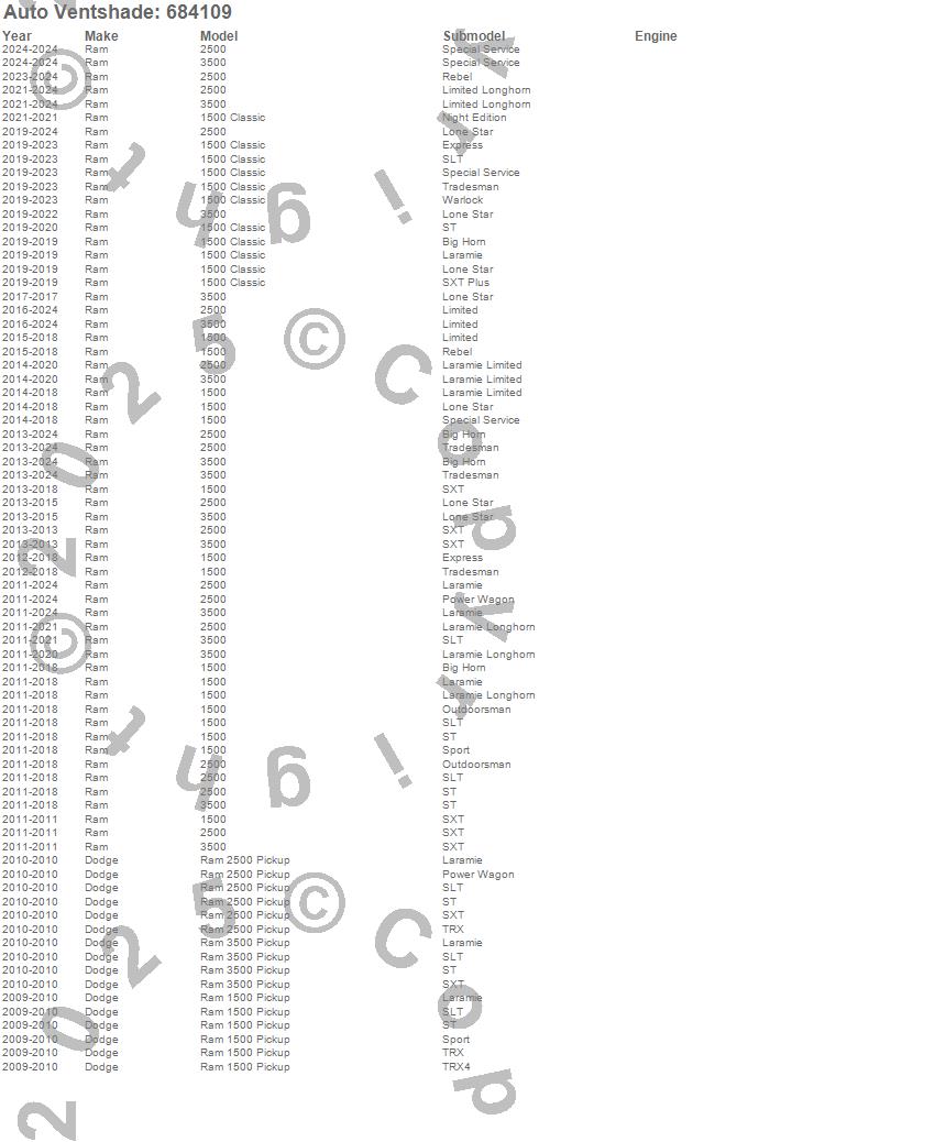 Below is an abbreviated list of applications for the Chrome Ventvisor Deflector 4 pc..1500, 1500 Classic, 2500, 3500, Ram 1500, Ram 2500, Ram 3500, Dodge, Ram, 2024, 2023, 2022, 2021, 2020, 2019, 2018, 2017, 2016, 2015, 2014