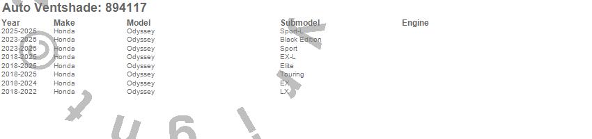 Below is an abbreviated list of applications for the Ventvisor Low Profile Deflector 4 pc..Odyssey, Honda, 2026, 2025, 2024, 2023, 2022, 2021, 2020, 2019, 2018