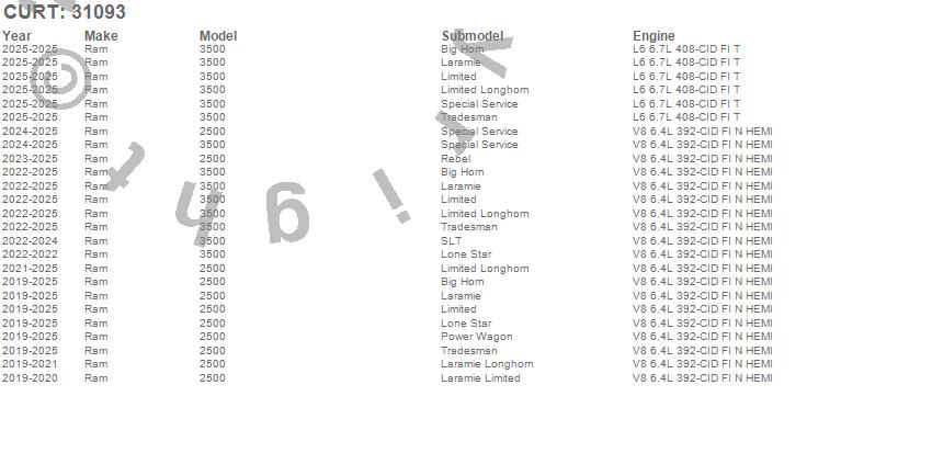 Below is an abbreviated list of applications for the 2 in. Receiver Hitch.2500, 3500, Ram, 2026, 2025, 2024, 2023, 2022, 2021, 2020, 2019