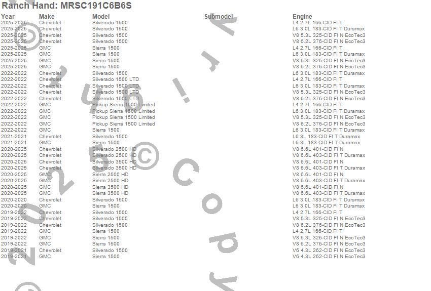 Brand: Ranch HandPart Number: MRSC191C6B6SNerf/Step Bar (Wheel to Wheel) Type: Matte Black - Steel - 6 StepsUPC: 848917010329