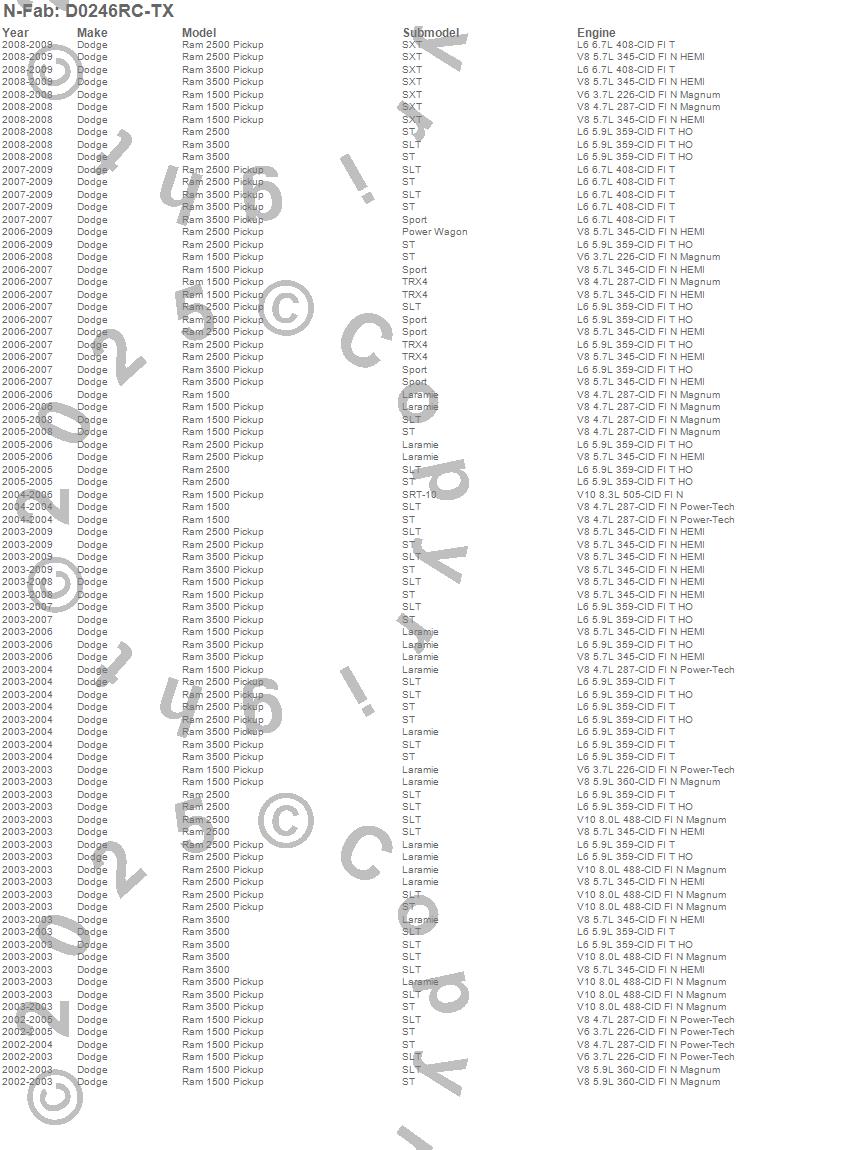 Below is an abbreviated list of applications for the Cab Length Nerf Step Bar.Ram 1500, Ram 2500, Ram 3500, Dodge, 2009, 2008, 2007, 2006, 2005, 2004, 2003, 2002