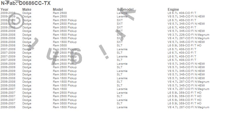 Below is an abbreviated list of applications for the Cab Length Nerf Step Bar.Ram 1500, Ram 2500, Ram 3500, Dodge, 2009, 2008, 2007, 2006