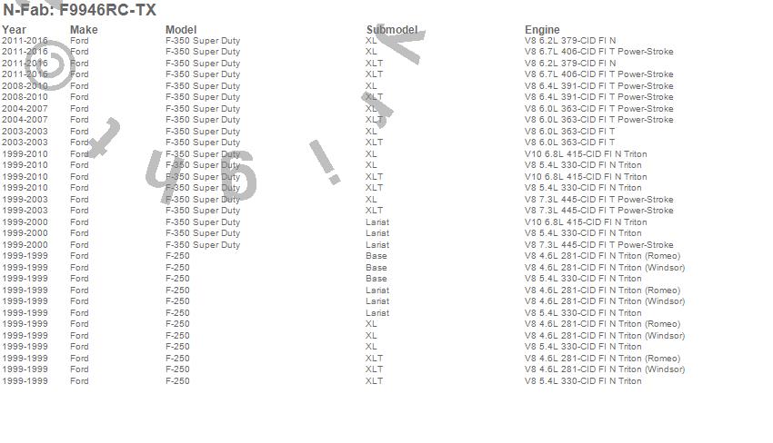 Below is an abbreviated list of applications for the Cab Length Nerf Step Bar.F-250, F-350 Super Duty, Ford, 2016, 2015, 2014, 2013, 2012, 2011, 2010, 2009, 2008, 2007, 2006, 2005, 2004, 2003, 2002, 2001, 2000