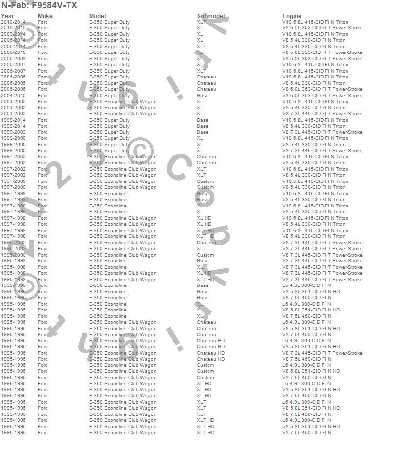 Below is an abbreviated list of applications for the Wheel To Wheel Nerf Step Bar.E-350 Econoline, E-350 Econoline Club Wagon, E-350 Super Duty, Ford, 2014, 2013, 2012, 2011, 2010, 2009, 2008, 2007, 2006, 2005, 2004, 2003, 2002, 2001, 2000, 1999