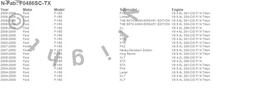 Below is an abbreviated list of applications for the Wheel To Wheel Nerf Step Bar.F-150, Ford, 2008, 2007, 2006, 2005, 2004