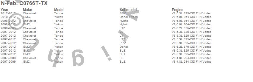 Below is an abbreviated list of applications for the Wheel To Wheel Nerf Step Bar.Tahoe, Yukon, Chevrolet, GMC, 2012, 2011, 2010, 2009, 2008, 2007